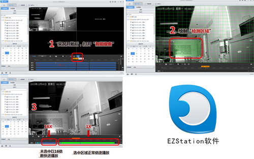 EZStation实现从海量数据中快速提取有效数据,提高检索效率。使用方式:用户选定检索区域后,系统对选区内的录像进行智能分析,判断检索区域是否存在物体运动,同时用不同的颜色区块标识出来,快速检索。另外,用户如需查看特定时段录像,也可进行选定设置,非检索录像会以16倍数的快进速度进行回放;符合检索条件的录像则会以正常倍数进行播放。